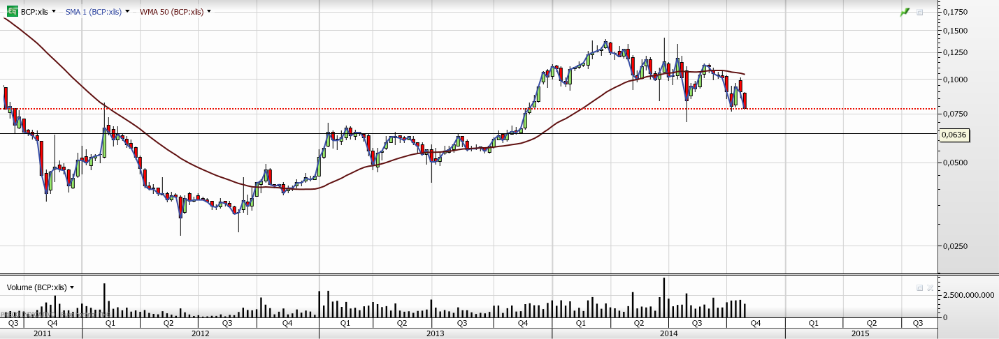 Podes ter razão sem duvida, o facto de ter fechado em mínimos da sessão mas enquanto não for quebrado o suporte mesmo importante dos 0.0775 aproximadamente não há muito a temer!! O bcp tem sido bastante castigado ultimamente, acredito que possa ser agora o momento de viragem, com a criação do duplo fundo. vamos aguardar para ver os próximos dia!!fica o gráfico com a minha previsão!! tanto que se fala dos 0.13 até ao final do ano, é a única figura ( duplo fundo ), que se for ativado leva a cotação aos 0.13!!Abraço e boas apostas!!