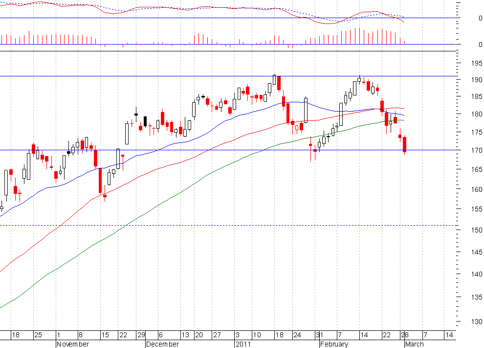 Na minha opinião o aspecto mais importante, e que ainda falta concretizar, para se falar em duplo topo tem a ver com a existência ou não da quebra em baixa da LTA e do suporte dos 174.00 USD, que se encontram a valores muito próximos. A quebra desta zona de suporte, constituída pela LTA e pelo suporte, será o mote para que se possa falar em activação do duplo topo, o que poderá trazer a cotação a uma visita à zona de suporte dos 150.00 USD. Se a LTA sobreviver teremos de considerar também o cenário de regresso a máximos.