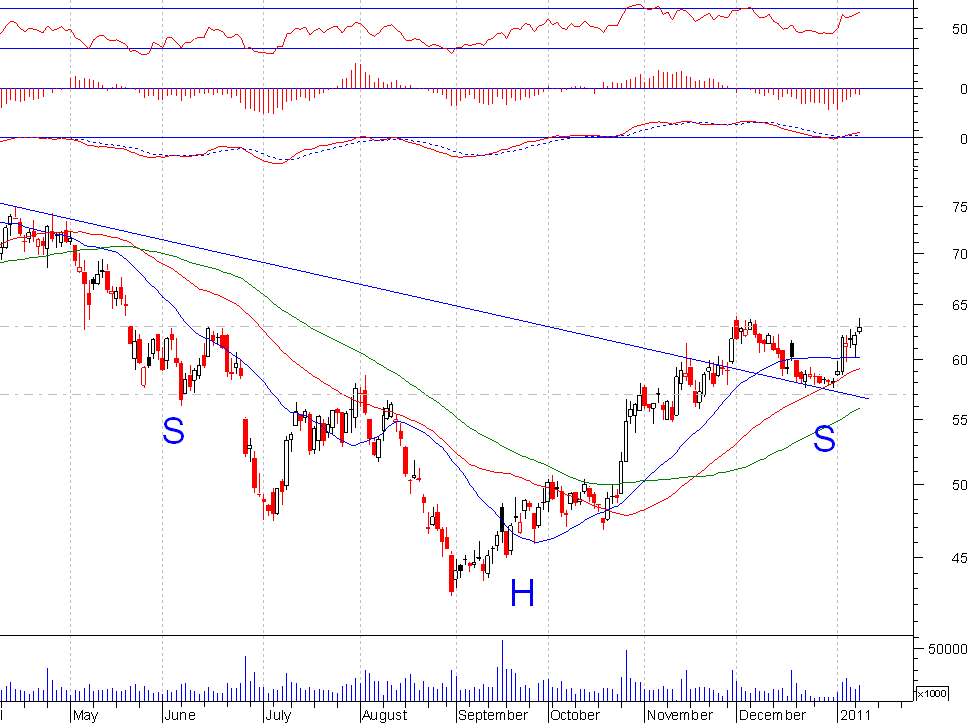 Poderemos ter para a semana um reteste à resistência/neckline, na zona dos 63, que a ter sucesso deverá levar a acção para a zona da sua resistência nos 77/80.