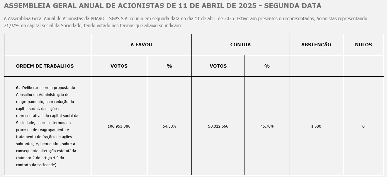 Comunicado |Lisboa | 26 demarço de 2025Assembleia Geral Anual de Acionistas da PHAROLA PHAROL, SGPS S.A. (“PHAROL”) informa que, na Assembleia Geral Anual de Acionistas realizada hoje, pelos Senhores Acionistas foi deliberado aprovar:Ponto Um: O relatório de gestão, o balanço e as contas individuais, relativos ao exercício de 2024; Ponto Dois: O relatório de gestão, o balanço e as contas consolidados, relativos ao exercício de 2024; Ponto Quatro: SOCIEDADE; A apreciação geral da administração e da fiscalização da Ponto Cinco: A aquisição e a alienação de ações próprias.Quanto ao Ponto Três, relativo à proposta de aplicação de resultados, a PHAROL decidiu submeter à Assembleia Geral Anual de 26 de março a seguinte proposta de aplicação de resultados que já constava dos seus documentos de prestação de contas: “Considerando que no exercício findo em 31 de dezembro de 2024 se apurou um resultado líquido positivo no montante de 24.207.036 euros, propõe-se que este valor seja transferido para Resultados Transitados da Empresa.”Um Acionista, após ter aprovado o Relatório e Contas Individuais, no âmbito do ponto 1 da ordem de trabalhos, votou contra a proposta de aplicação de resultados apresentada pelo Conselho de Administração por entender aplicável o artigo 29/1/b) dos estatutos da SOCIEDADE que dispõe o seguinte: “uma percentagem não inferior a 40% (quarenta por cento) dos lucros distribuíveis será distribuída pelos acionistas, a título de dividendo, sem prejuízo de a Assembleia Geral, por maioria qualificada de dois terços dos votos expressos, poder deliberar no sentido da redução do dividendo ou mesmo da sua não distribuição”.A proposta apresentada pelo Conselho de Administração foi votada favoravelmente apenas por maioria simples (52%) dos votos, a qual é inferior aos 2/3 previstos no artigo 29/1/b) dos estatutos da SOCIEDADE, caso se entenda que esta disposição poderia ser aplicável ao caso.O Conselho de Administração, no melhor interesse da SOCIEDADE - tendo em conta (i) o disposto no artigo 324 do Código das Sociedades Comerciais (CSC) e que a PHAROL regista, entre outras, reservas indisponíveis de montante igual ao montante por que estão contabilizadas as suas ações próprias; (ii) e, por sua vez, que, nos termos do artigo 32 do mesmo código, “não podem ser distribuídos aos sócios bens da sociedade quando o capital próprio desta, incluindo o resultado líquido do exercício, tal como resulta das contas elaboradas e aprovadas nos termos legais, seja inferior à soma do capital social e das reservas que a lei ou o contrato não permitem distribuir aos sócios ou se tornasse inferior a esta soma em consequência da distribuição” - considera que não existem condições para distribuir qualquer dividendo relativo ao exercício findo em 31 de dezembro de 2024, porquanto não pode considerar-se que existam lucros distribuíveis em face do citado artigo 32 do CSC, norma que impede a distribuição e, por conseguinte, não pode ser aplicado ao caso o artigo 29/1/b dos estatutos.Relativamente ao ponto número seis da Ordem de Trabalhos da Assembleia Geral da PHAROL, SGPS S.A., realizada hoje tem como objeto uma alteração aos estatutos da SOCIEDADE para o que é necessária a presença ou representação de acionistas detentores de, pelo menos, ações correspondentes a 1/3 do capital, conforme determinado pelo artigo 383 /2 do CSC, o que no momento da discussão e deliberação quanto a este ponto não ocorreu, foi então declarada a inexistência de quórum constitutivo mínimo para que essa deliberação fosse discutida e votada.Assim, como fixado nos termos do artigo 383/4 do CSC, a Assembleia Geral reunirá na segunda data já indicada, isto é, às 11:00 horas do dia 11 de abril de 2025, no Auditório do Museu Arpad Szenes – Vieira da Silva, Praça das Amoreiras, 56, 1250-020 em Lisboa para discussão e votação do ponto número seis da Ordem de Trabalhos infra indicado:Ponto Seis: Deliberar sobre a proposta do Conselho de Administração de reagrupamento, sem redução do capital social, das ações representativas do capital social da Sociedade, sobre os termos do processo de reagrupamento e tratamento de frações de ações sobrantes, e, bem assim, sobre a consequente alteração estatutária (número 2 do artigo 4.º do contrato da socieda