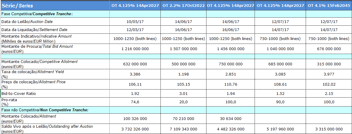 https://eco.pt/2017/07/07/juros-portugueses-aceleram-com-leilao-de-obrigacoes-a-vista/ Escreveu:Taxas da dívida portuguesa avançam com a notícia de que o IGCP se prepara para anunciar novo leilão de dívida. Commerzbank antecipa financiamento a 5 e 10 anos num montante até 1.250 milhões.