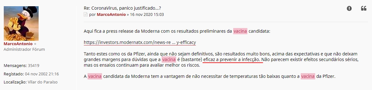mval2002 Escreveu:Tenho tambem muitos recortes de jornal guardados, entrevistas do Fauci, Biden, Walensky, Bourla, Marcelo, Almirante, press releases da Pfizer e Moderna, artigos do Publico, Expresso, etc. que poderei partilhar a dizer textualmente que a vacina iria conferir proteccao conta a infeccao e imunidade de grupo.