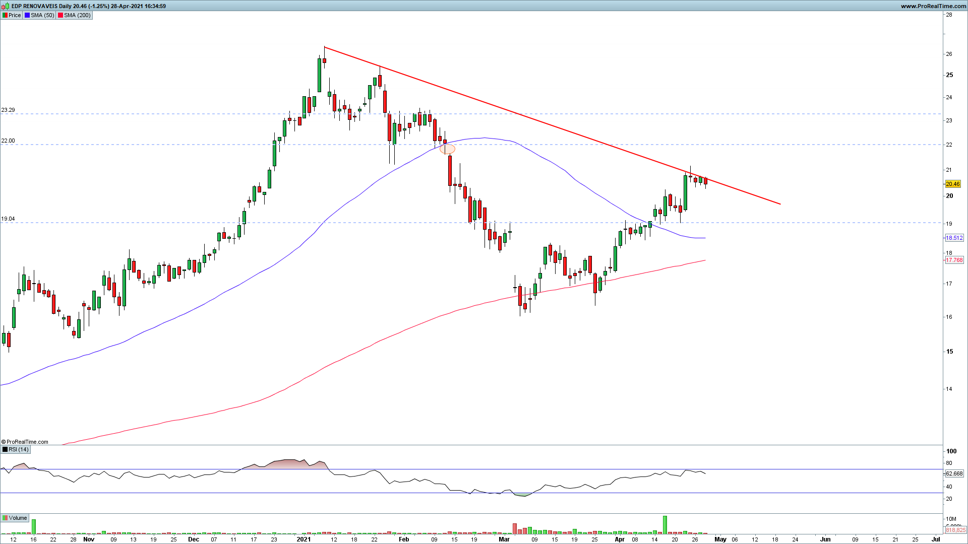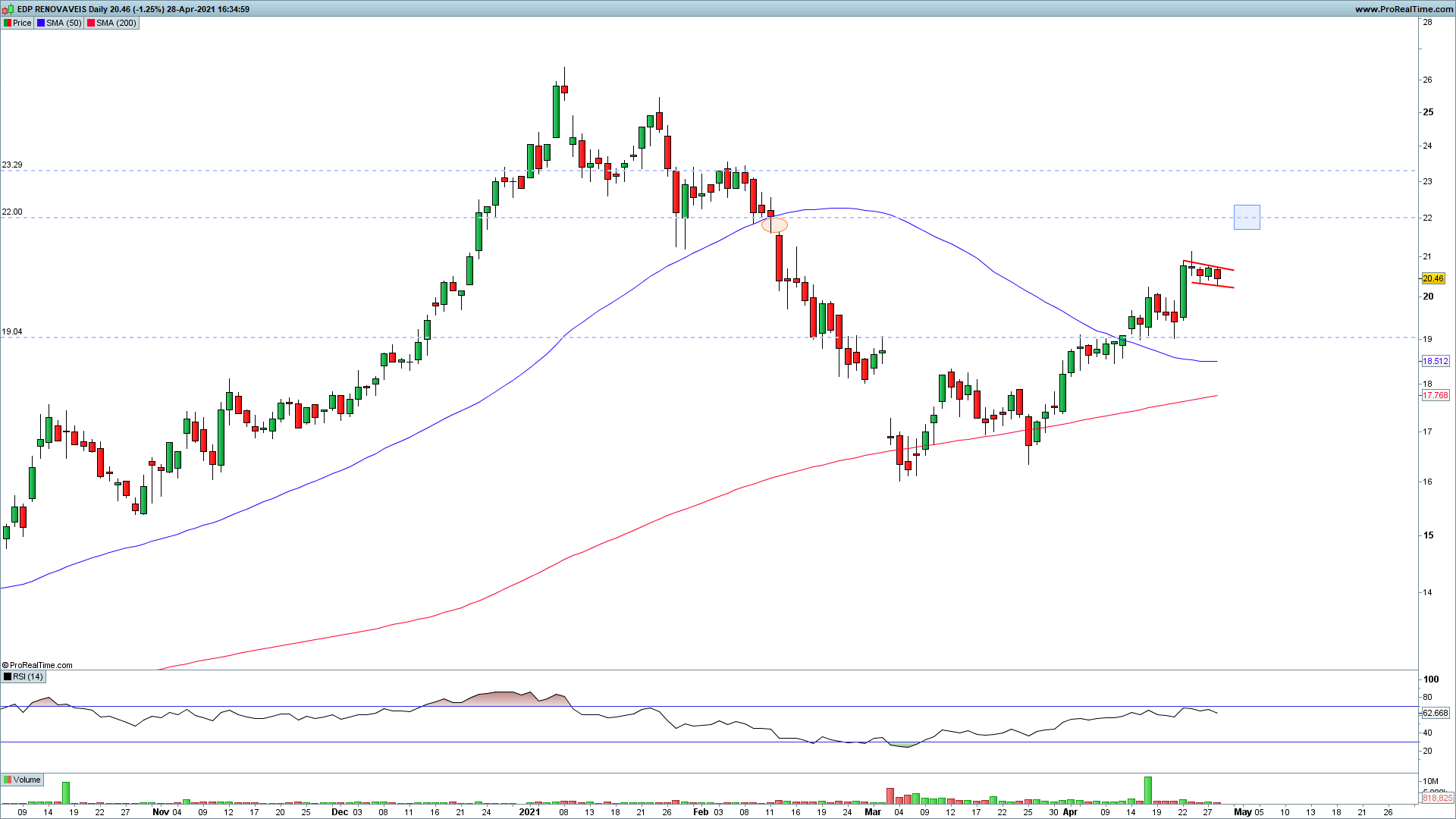 Quanto a possíveis movimentos, podemos estar a meio de uma flag com target a rondar os 22, onde tem aquele gap e resistência horizontal.