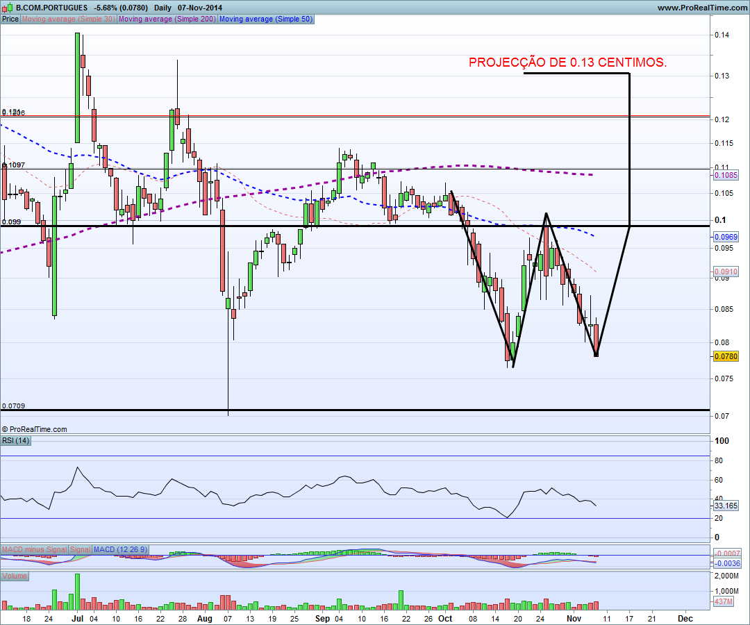Podes ter razão sem duvida, o facto de ter fechado em mínimos da sessão mas enquanto não for quebrado o suporte mesmo importante dos 0.0775 aproximadamente não há muito a temer!! O bcp tem sido bastante castigado ultimamente, acredito que possa ser agora o momento de viragem, com a criação do duplo fundo. vamos aguardar para ver os próximos dia!!fica o gráfico com a minha previsão!! tanto que se fala dos 0.13 até ao final do ano, é a única figura ( duplo fundo ), que se for ativado leva a cotação aos 0.13!!Abraço e boas apostas!!