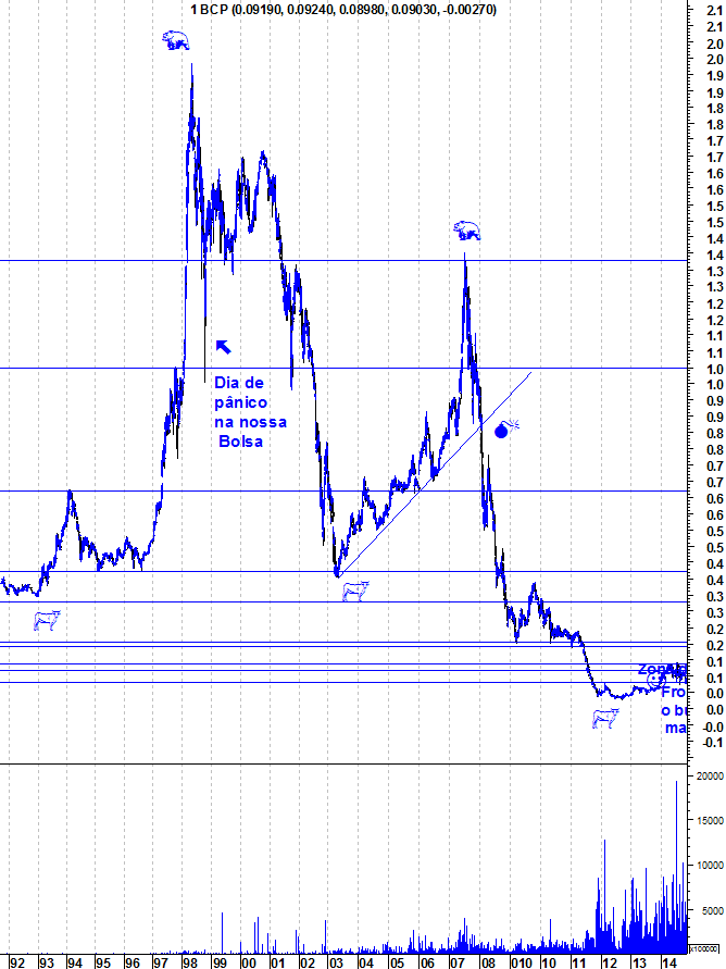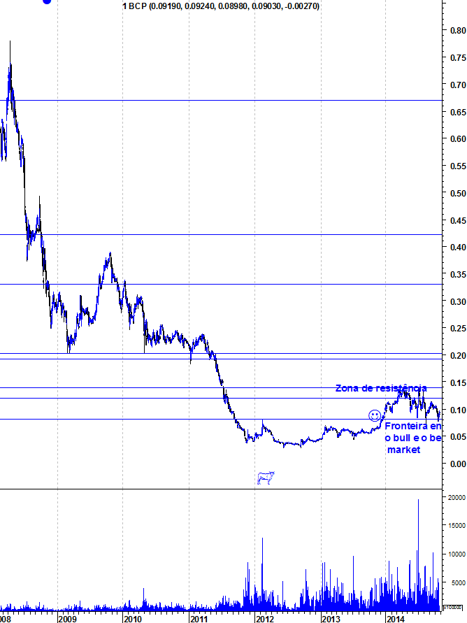 Tecnicamente, o BCP está em cima de uma formação, digamos, "perigosa"! Há, de facto, espaço para subir. Mas se houver inversão, este momento técnico a que me refiro costuma (não é regra, mas verifica-se muitas vezes...) atirar as cotações com violência para o lado que indica. Neste caso, o fenómeno, a acontecer, será bearish.