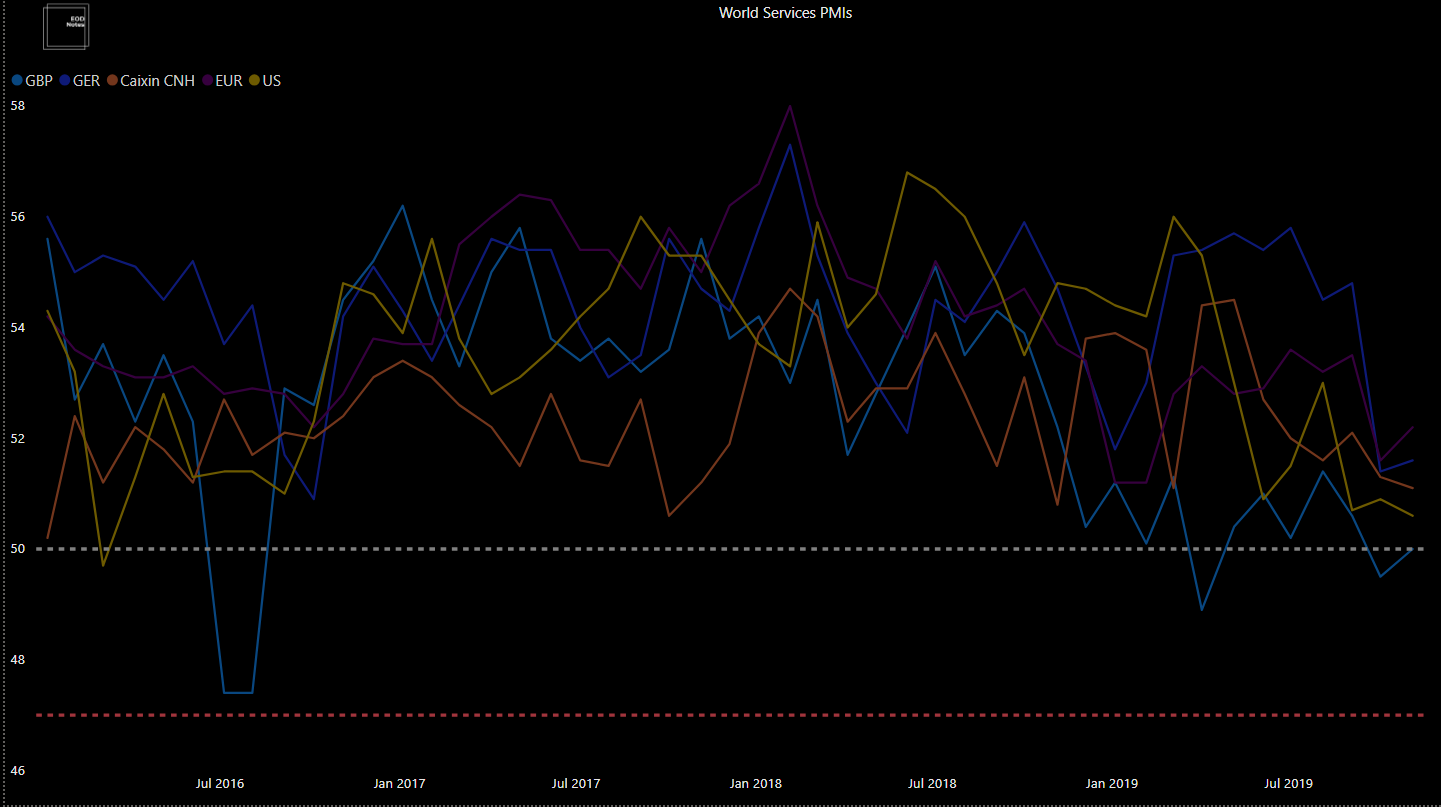 Service PMIs -> é uma medida de performance de empresas no sector dos serviços ( tem bastante relevância econômica do ponto de vista de forex e mercados por serem indicadores de possíveis crises econômicas. O indicador abaixo de 50, está em linha de "emergência" )