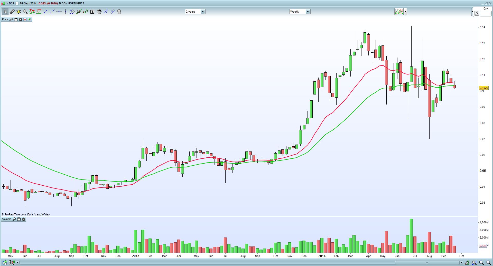 Parece-me que existe um canal descendente bem definido com inicio em Abril, terá que quebrar em alta e com volume os 0.11€.