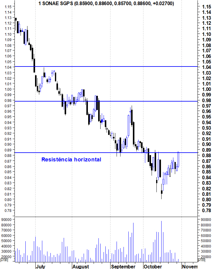 A Sonae continua a sua recuperação das últimas sessões. No entanto, este movimento continua a ser visto como apenas um ressalto. Para os outros (aproveitando a época de liga dos campeões, uso uma expressão futebolística) conseguirem dar um "pontapé na crise" precisam de quebrar consistentemente a resistência dos 0,89 euros. Até que isso aconteça, estas subidas são vistas apenas como um ressalto.