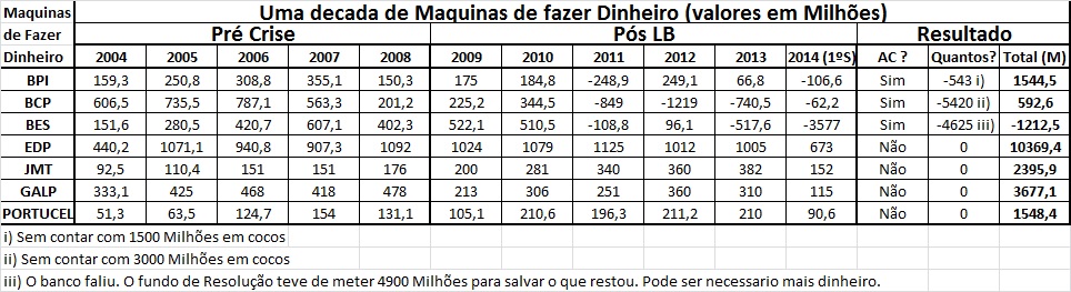 Olhe, já que estamos no tópico do bcp, este banco, está maquina de fazer dinheiro, em 2012 fez -1200 Milhões, em 2013 fez -800 Milhões e em 2014, em meio ano ainda está nos -62 Milhões. Resultado, nos ultimos 2,5 ano, está maquina de fazer dinheiro perdeu quase 2100 Milhões, que, entre outras coisas, obrigaram os investidores a por muito $$ apenas para ver reduzido o prejuizo. Bem que o bcp pode/deve/tem de dar lucros nos próximos 10 anos para compensar os accionistas.