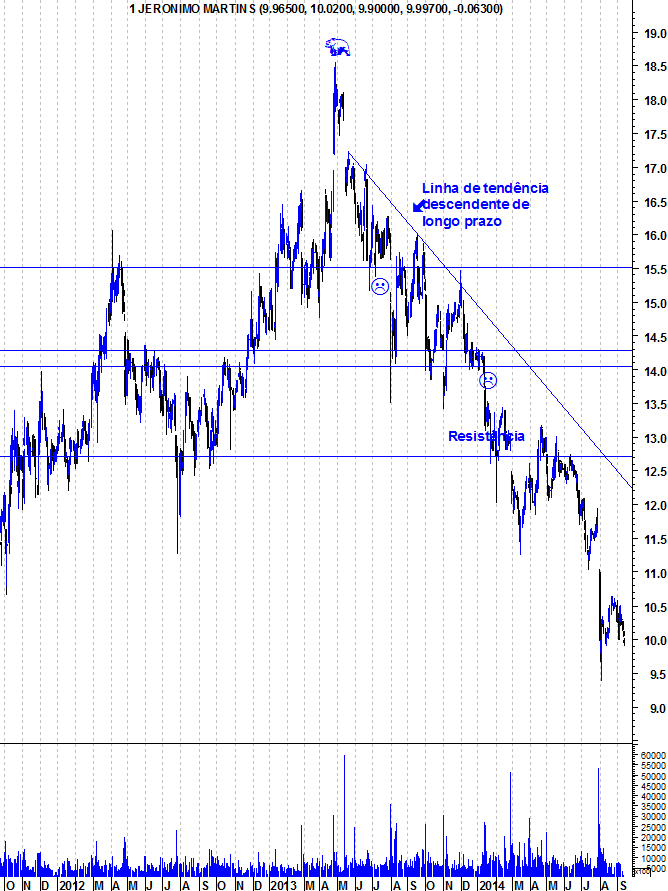 Deixo aqui os gráficos actualizados da Jerónimo Martins. A acção continua com uma tendência descendente em todos os horizontes temporais e, enquanto a LT descendente de longo prazo não for quebrada, os ursos continuarão a dominar a acção.