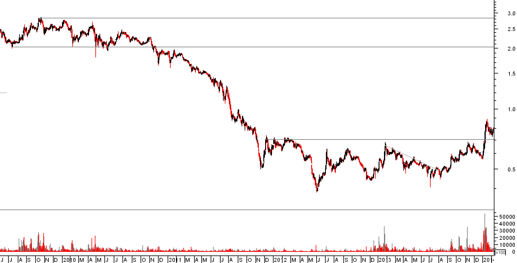 - Admitindo que a figura é válida e a quebra está feita, pode pensar-se num trade de curto-médio prazo, com uma entrada já aos 0,79, com stop nos 0,73 (perda potencial máxima de 7,5%), mas com projecção máxima para 1,05 (ganho potencial de 33%), portanto uma relação de 4,5 euros de ganho por cada euros potencialmente perdido. Parece ser uma relação óptima.