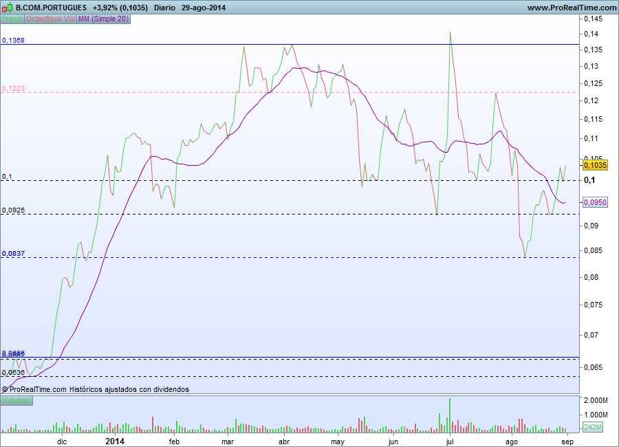 - desde que bateu de rompante nos 0,07 e reagiu, tem quebrado resistencias, pelo menos 2, e essas transformaram-se em suportes porque têm aguentado e segurado a cotação. O ultimo foi a zona dos 0,097€ / 0,10€