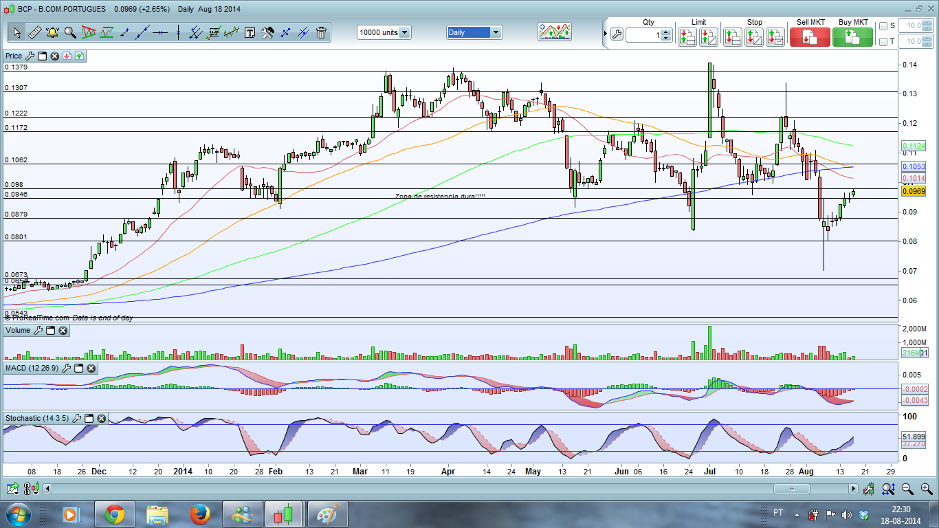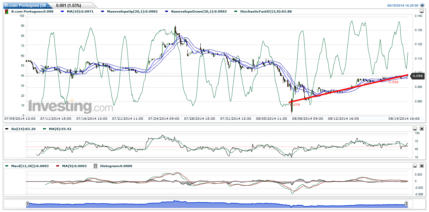 O BCP encontra-se em consolidação no horário continuo dentro na expectativa da quebra dos 0,098 - 0,1