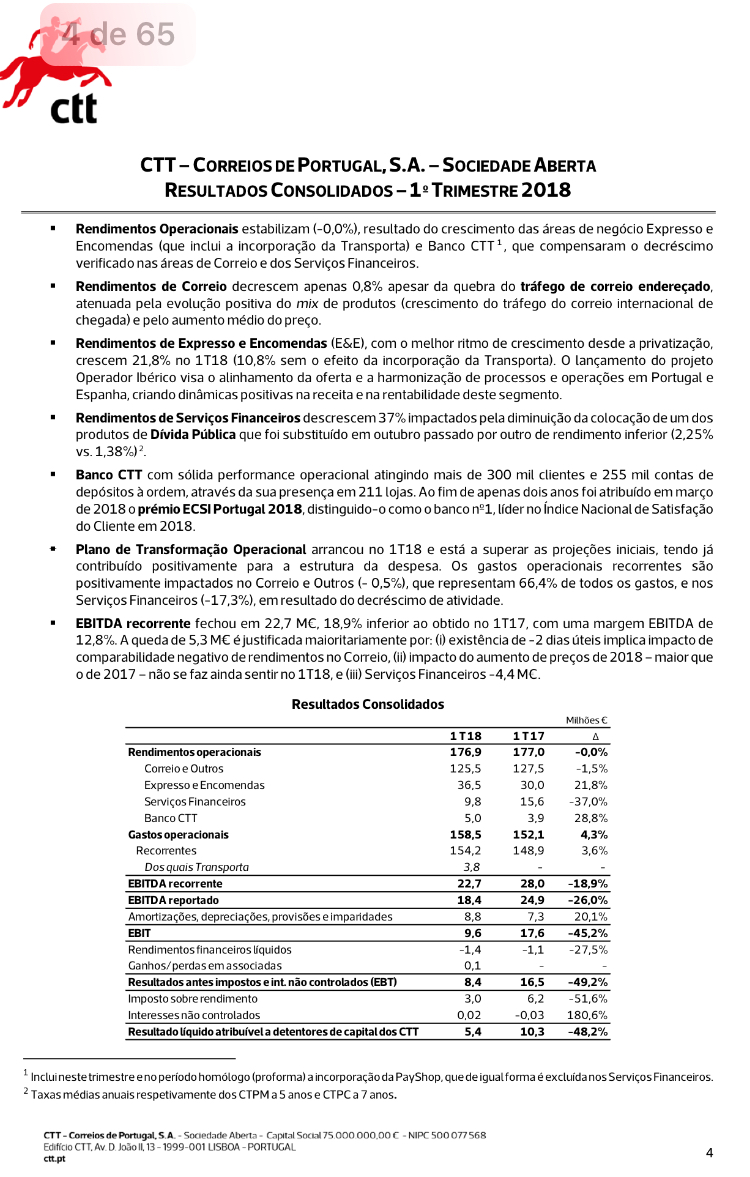Artista Romeno, o Banco CTT não perde mais dinheiro como dizes. Aumentou os rendimentos em 28,8%. Havendo Plano de Restruturação parece-me mais lógico comparar 1Q de 2018 com IVQ de 2017. E a evolução é positiva.