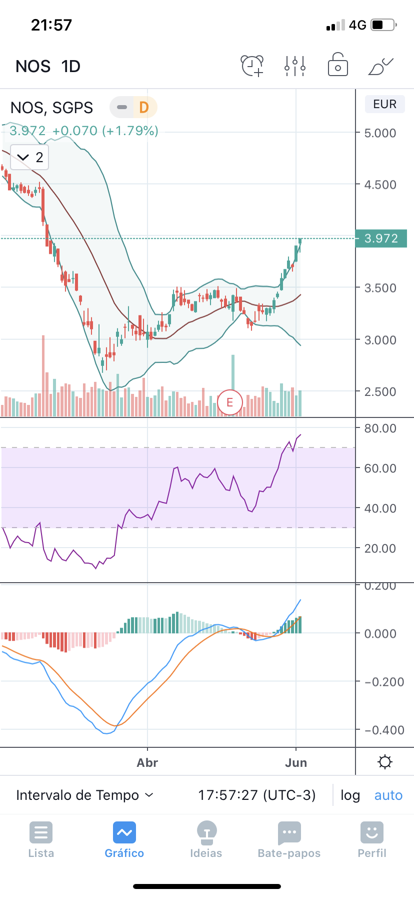 A prudência manda vender e é provável haver aqui alguma retração dada a sobrecompra nos índices, mas a NOS terá sempre o dividendo a pôr a mão por baixo, daí estar convencido que mesmo que haja uma correção mais forte os 3.75 funcionarem mesmo como suporte. Em caso dos mercados vontarem de novo para norte a NOS dispara bem para cima de 4 euros.