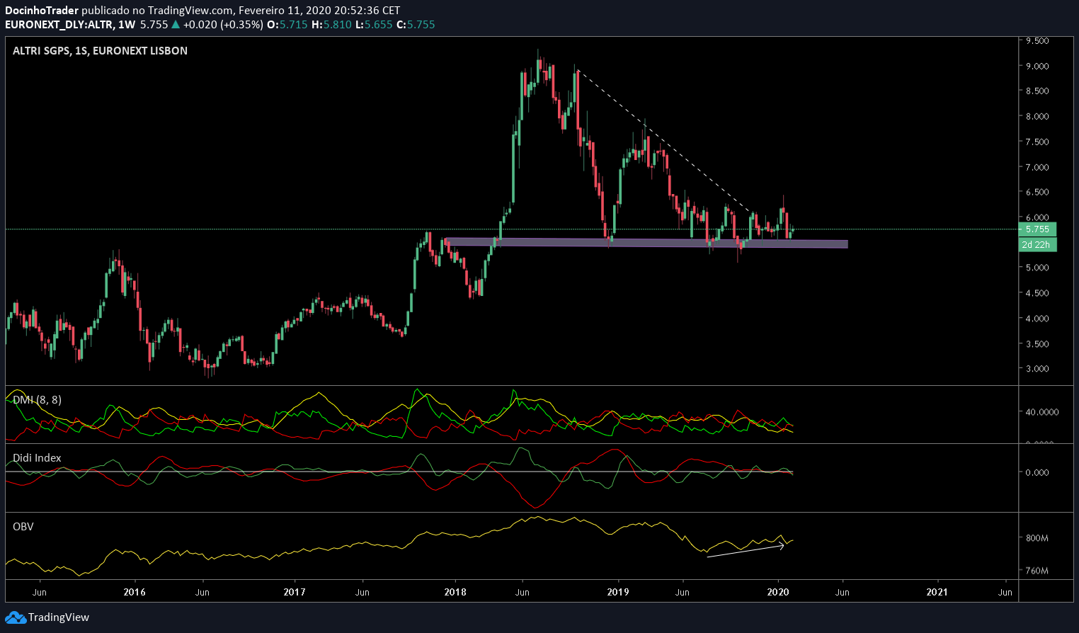Aqui não houve grande alteração, houve a rejeição do preço para sair fora do range e neste momento encontra-se lateralizada, assim como os indicadores,o OBV continua acumulativo.
