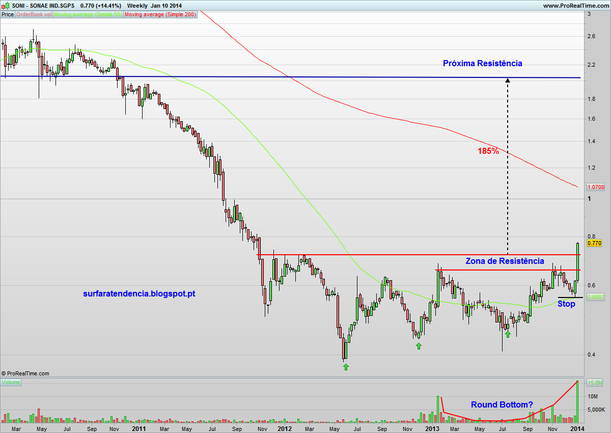 A zona de stop está agora mais longe (nos 0,56€), o que torna uma entrada nesta zona mais arriscada. Ainda assim, e numa óptica de longo prazo, poderá ser uma acção interessante a seguir. Apesar de ser possível uma retracção, vejo como muito improvável nesta fase uma quebra em baixa desse ponto de stop. De qualquer forma estamos a 25% de distância e tudo é possível, pelo que se exige prudência!