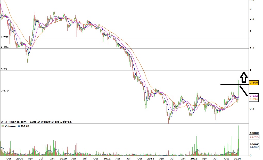 A ação está claramente num eixo bull, hoje como o resto da outras cotadas corrigiu... no entanto penso que criou um bom ponto de referencia os 0,80 pois andou todos o dia a rondar esse valor, assim se amanha superar esse valor com volume acho que temos caminho aberto para novas subidas, e os próximos patamares com algum peso só os veja ali para os 1,00 embora pouco ténue, a médio e longo prazo penso que esta menina poderá ter pernas para andar até aos 1,60...