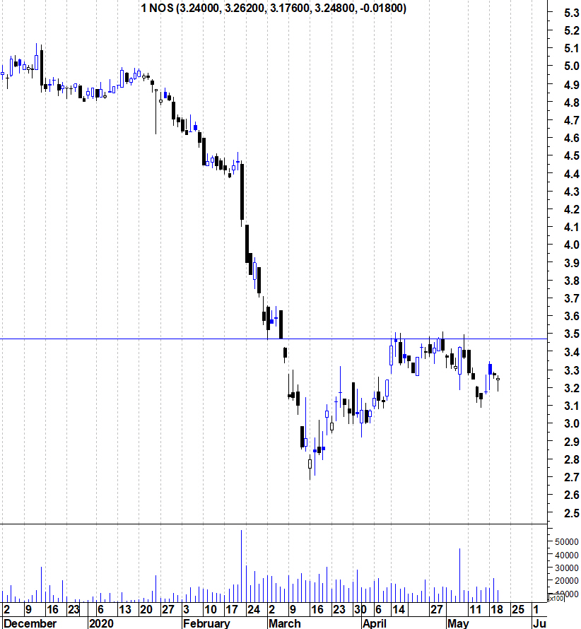 Deixo o gráfico actualizado da NOS no dia em que parece dar o primeiro sinal de força de curto prazo desde há muito tempo.