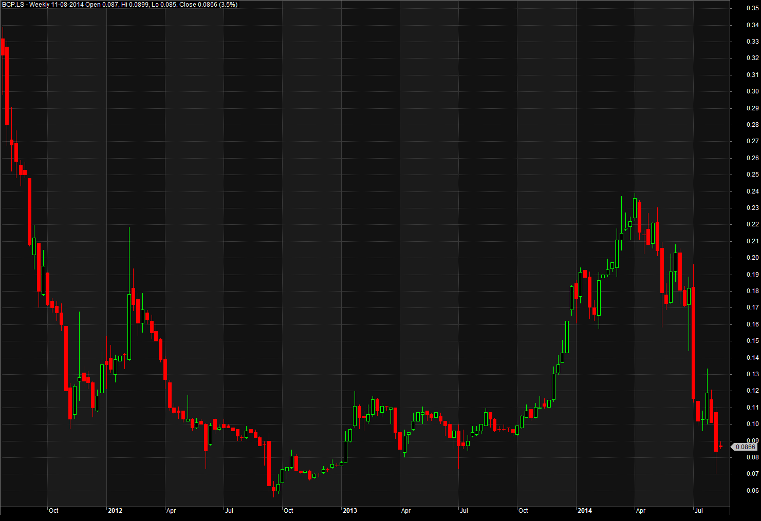 Parece que está a formar um head and shoulders bottom com neckline nos 0.12. Depois de toda esta trapalhada na banca, penso que mais uma vez vai entrar a manipulação de mercado à portuguesa para que se mostre aos investidores que, apesar do desastre do BES, está tudo um mar de rosas a florir em Portugal, podem estar todos descansados e continuem a meter o dinheiro "de fora cá dentro" com estas oportunidades de investimento que a gente agradece.