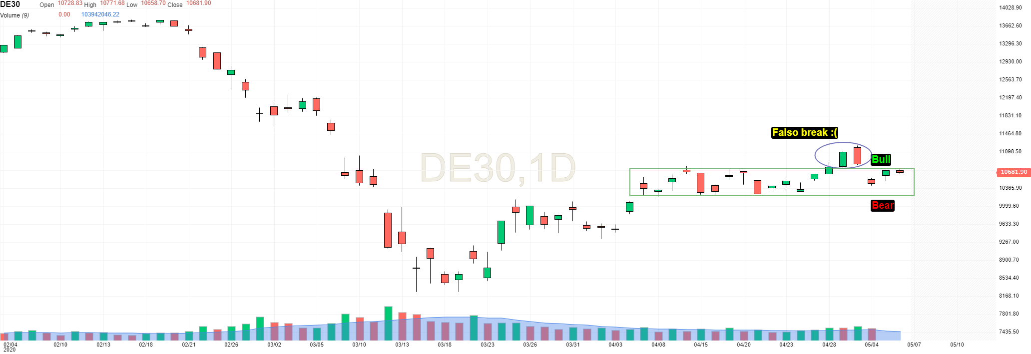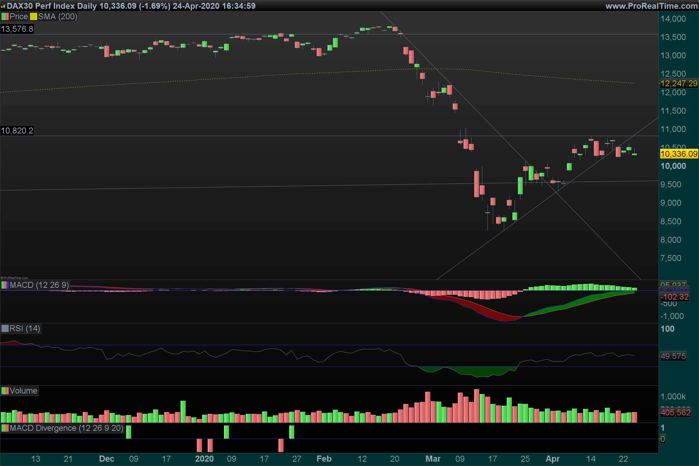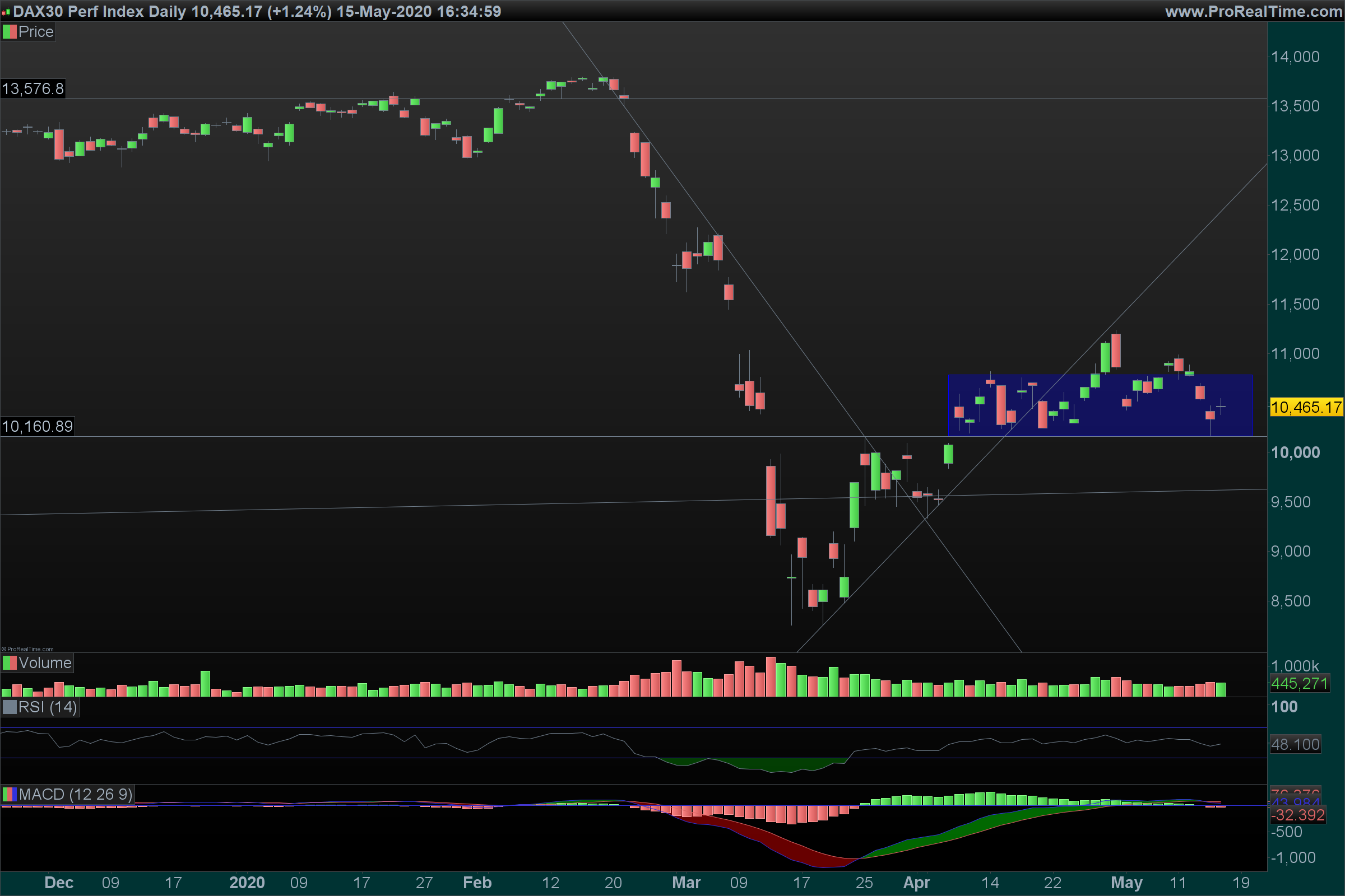 O DAX segue preso no rectângulo numa lateralização clara sem conseguir ganhar momento tendencial ascendente/descendente e cada vez que toca os limites volta imediatamente a valores intermédios. Terá de quebrar e toda esta consolidação trará movimentos fortes.