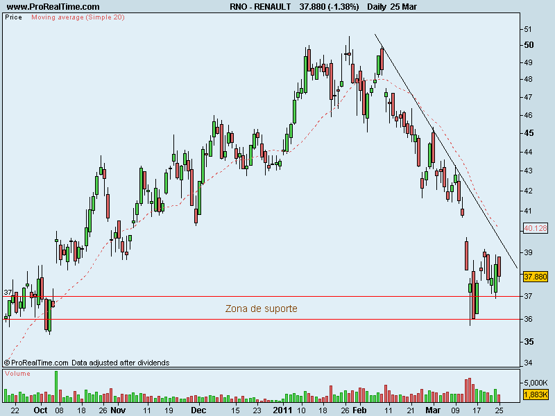 A Peugeot tem estado com mais força que a Renault nesta última semana. A Renault tem tido oscilações que denunciam fragilidade, está claramente descendente e neste momento sem nenhum suporte forte à vista, normalmente quando isto ocorre digo que a acção está no limbo e pode muito bem tornar-se num abismo.