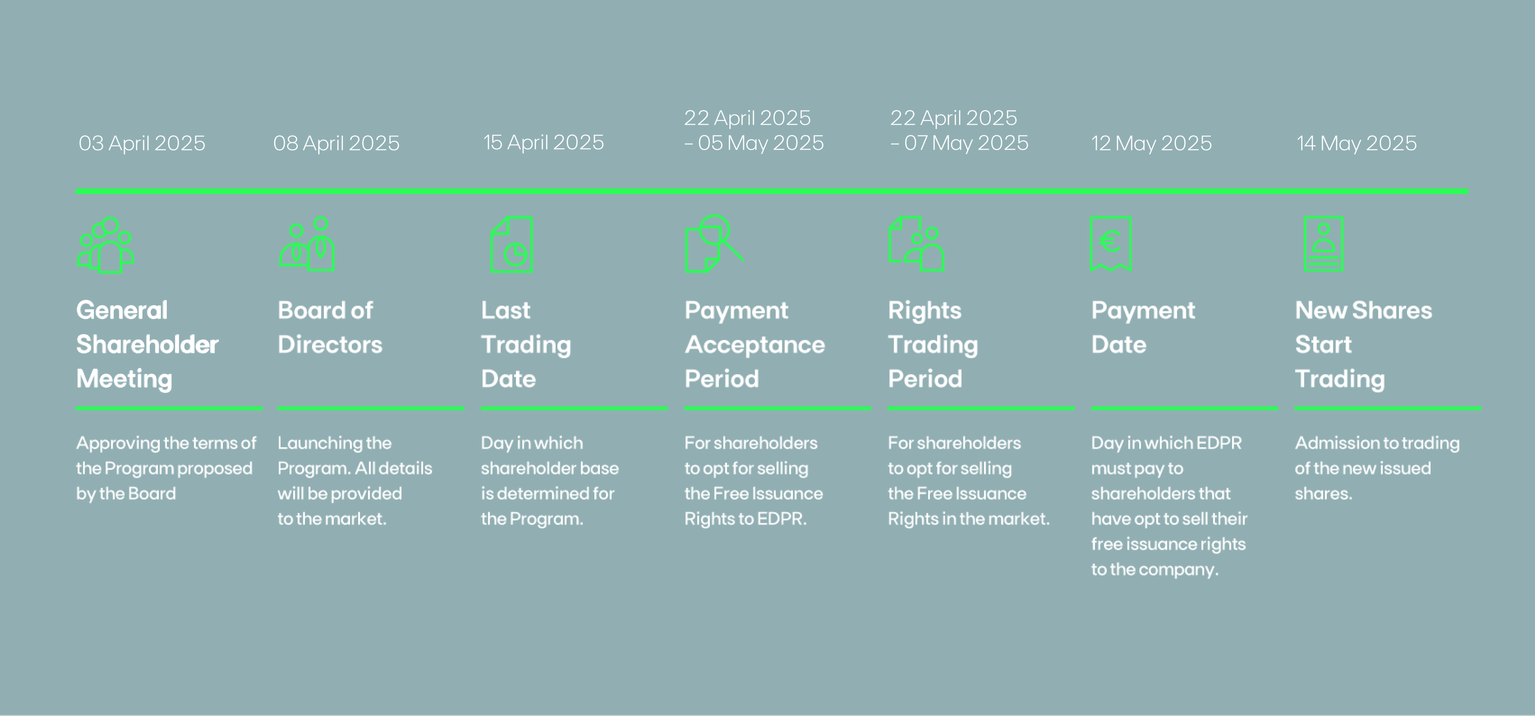 Se não comunicar qualquer opção ao seu intermediário financeiro, quando o período de negociação terminar, os seus direitos de incorporação serão convertidos automaticamente em novas ações já realizadas. O número de direitos de incorporação necessários a serem convertertidos para que os acionistas recebam uma ação da EDPR está sujeito à decisão do conselho de administração, após a aprovação do programa pela assembleia geral de acionistas da EDPR.