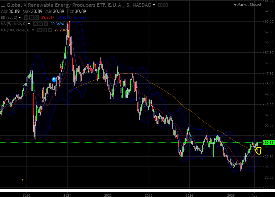 Golden cross no gráfico semanal entre a MM100 e MM20 no ETF das renováveis do Nasdaq, que curiosamente teve um reverse stock split no início do mês