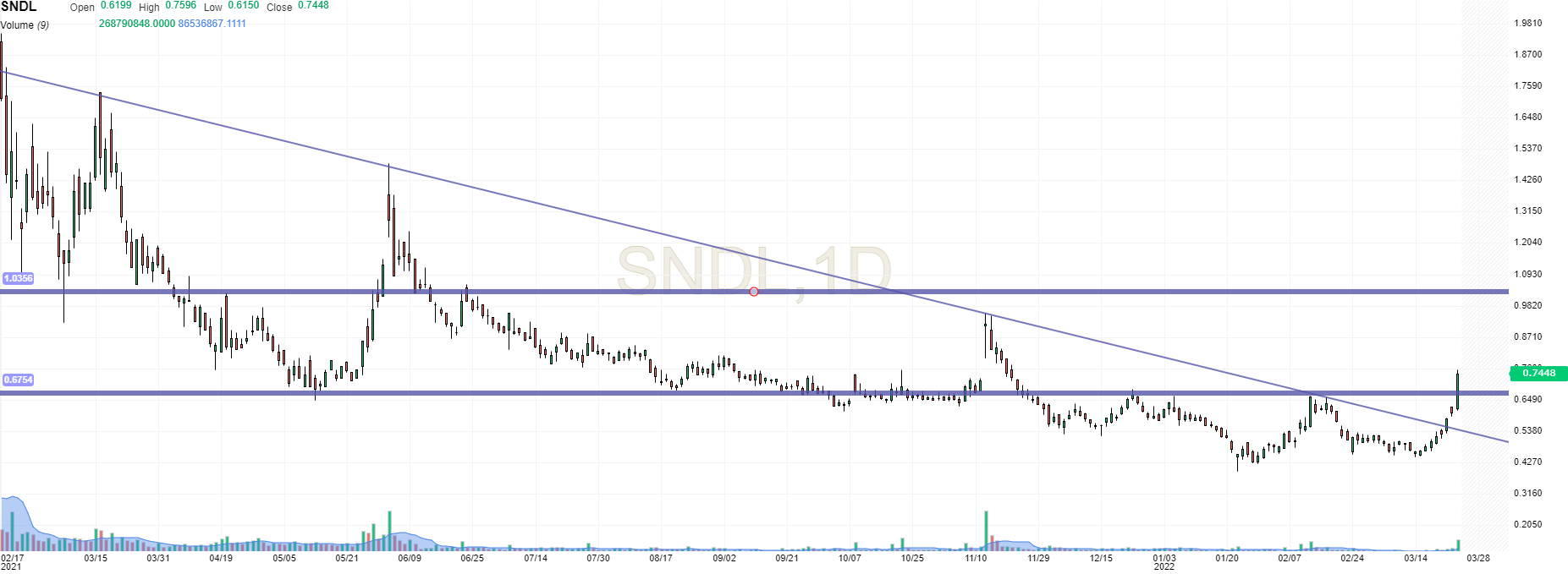 - deslistagem em Agosto. A SNDL precisa de permanecer 10dias acima de 1$ (achas que estando a 0,75 e 0,9 no PRE-Market pode ir a 0,45 sem ir a 1$? Pode acontecer, claro, mas penso que a probalidade maior é ir a 1$)