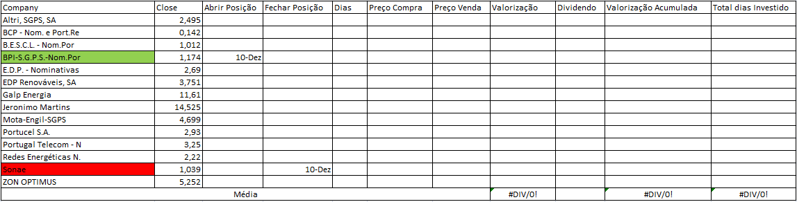 Para dar conhecimento do estado para cada um dos títulos deixo no anexo uma tabela com a indicação de Longo ("Verde") ou Neutro ("Vermelho"), a data da última indicação e a respectiva diferença relativa (%) face ao preço dessa data com o preço de fecho de sexta-feira dia 6 de Dezembro.