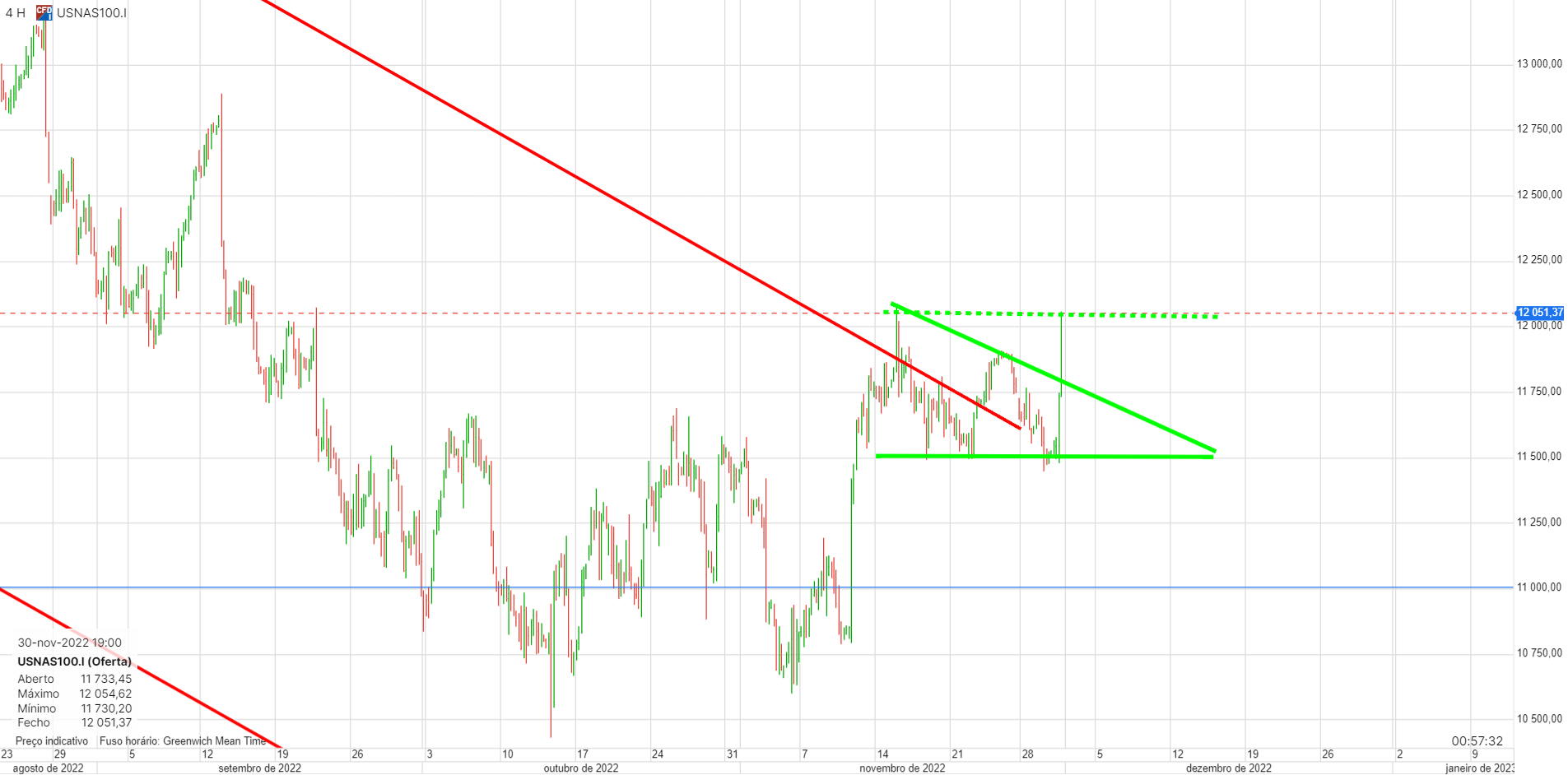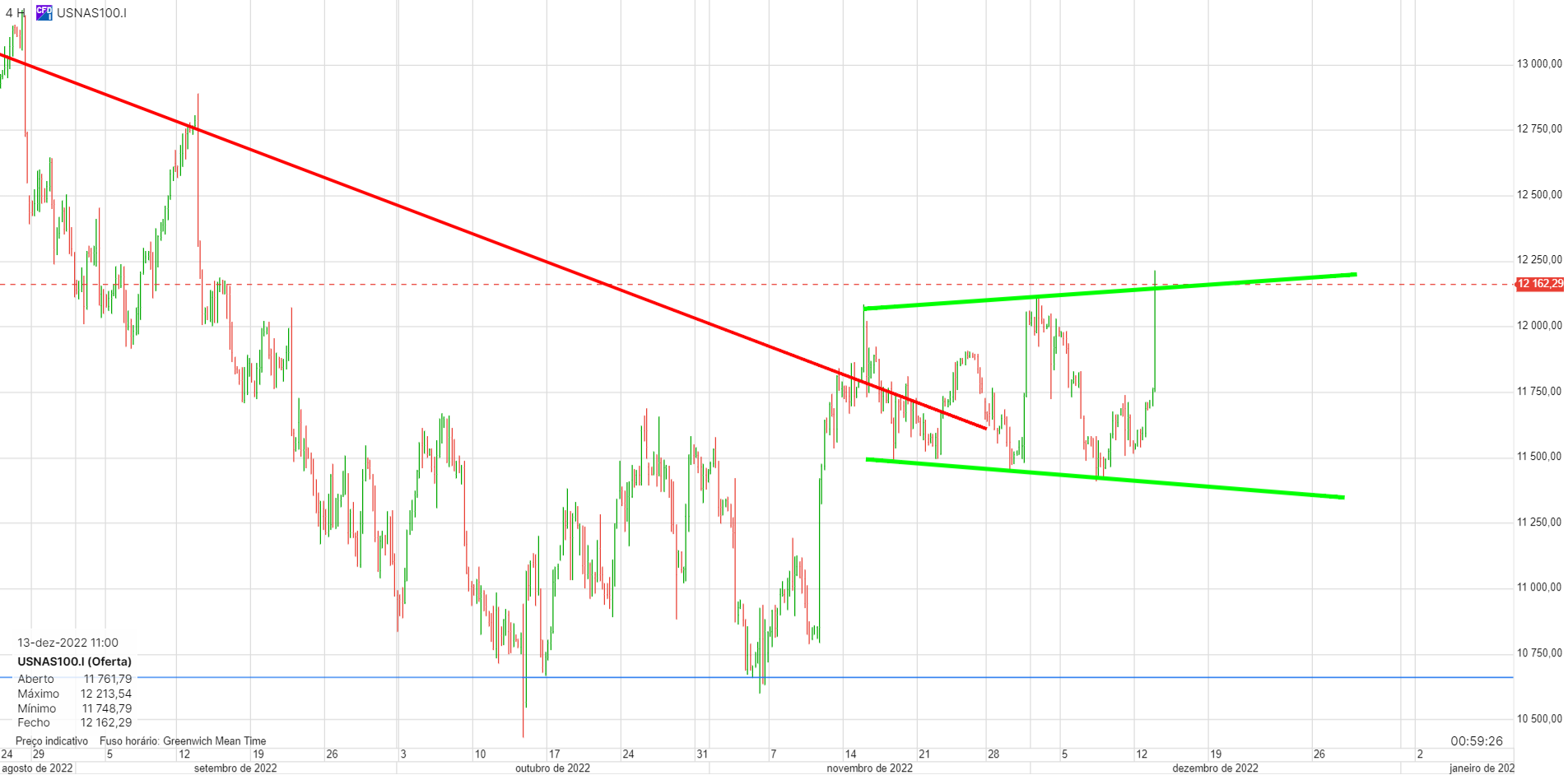 Há uma bandeira de alta (ou flamula, dependendo das linhas que se marquem) no gráfico de 4 horas. Estas flamulas ou bandeiras, são figuras de consolidação, ocorrem normalmente a meio do movimento e estas projetam o indice para a zona dos 12700. Se considerarmos uma flamula, já foi quebrada, se considerarmos uma bandeira, o preço está encostado ao topo.