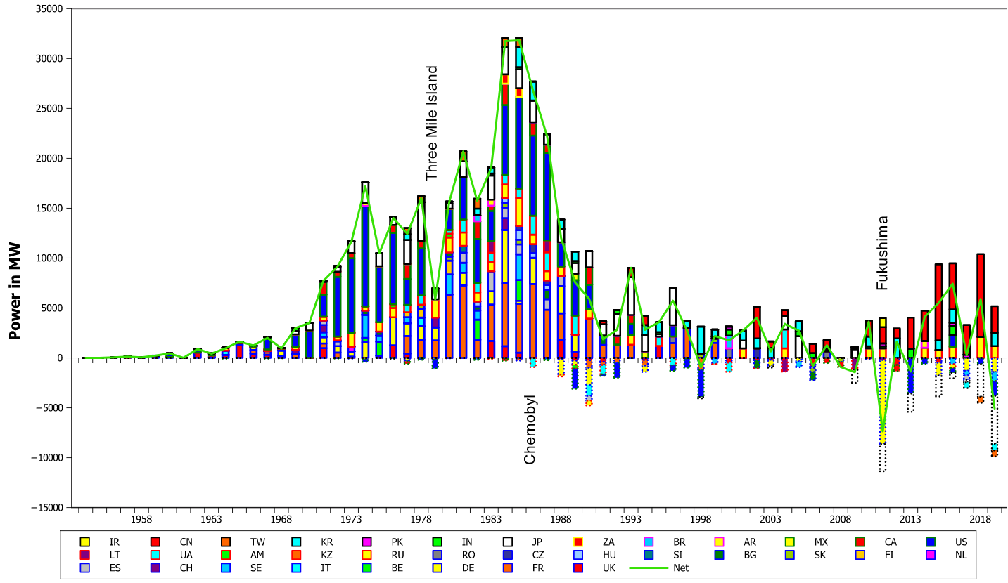 Esse grafico é enganador, refere a capacidade instalada, vs a capacidade desactivada, mais interessante é o acumulado produzido ao longo do anos, ou melhor, a % da energia electrica produzida ao longo do tempo é que dá uma ideia da importancia do nuclear no mix da produção global.