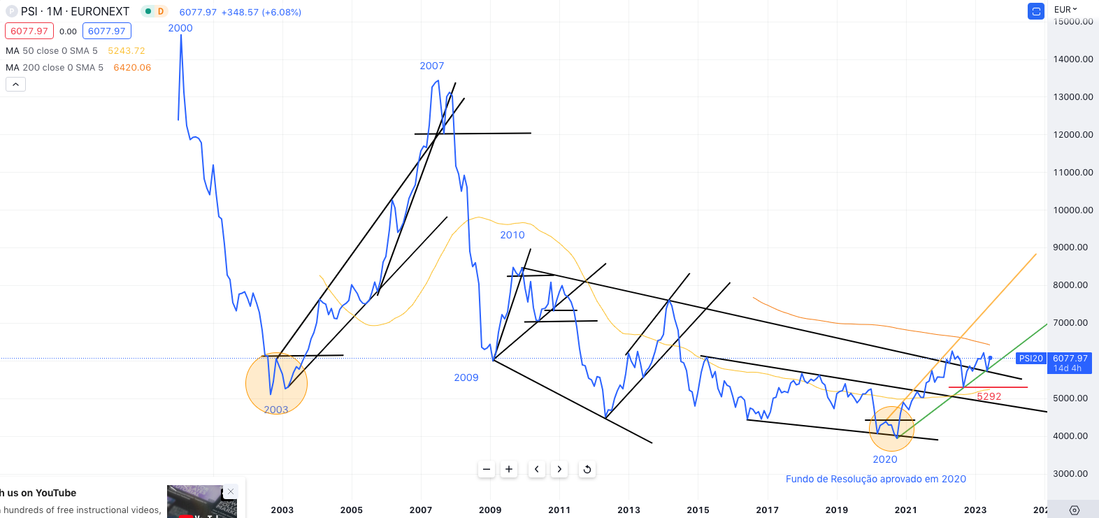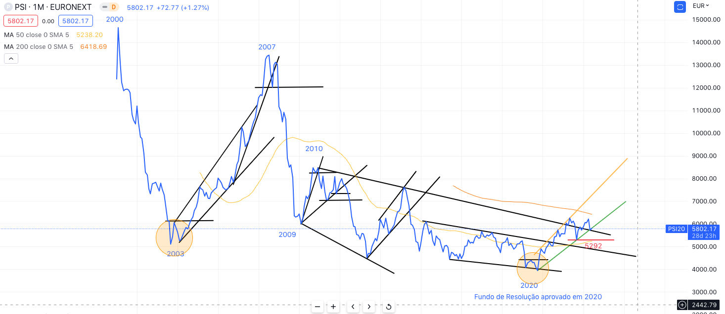 Resumindo, o mais importante neste momento é que a tendência do PSI20 é ascendente desde 2020 e que deixa de ser ascendente se descer abaixo de 5292.