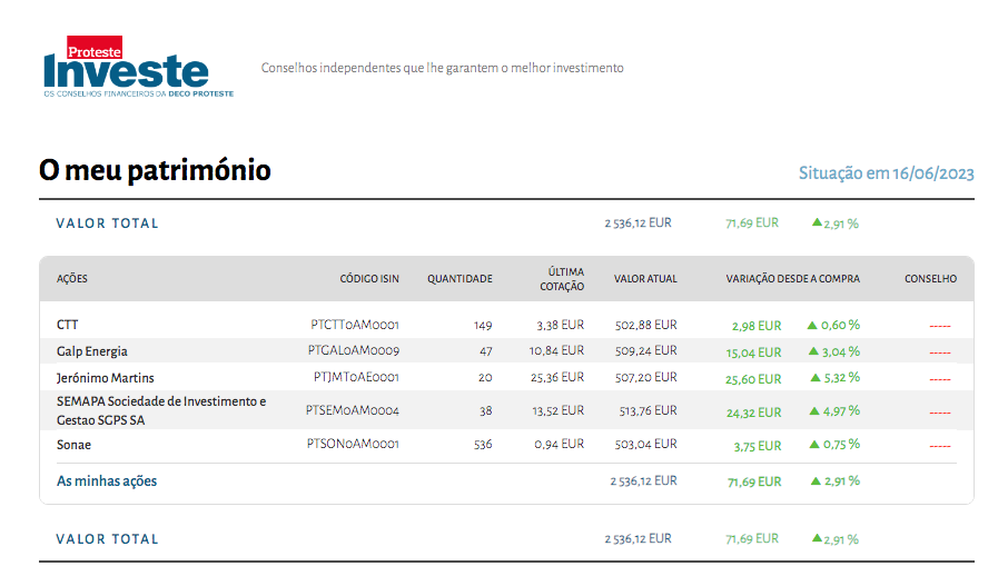 Criei uma carteira no site da Deco com as 5 ações. Agora está assim:
