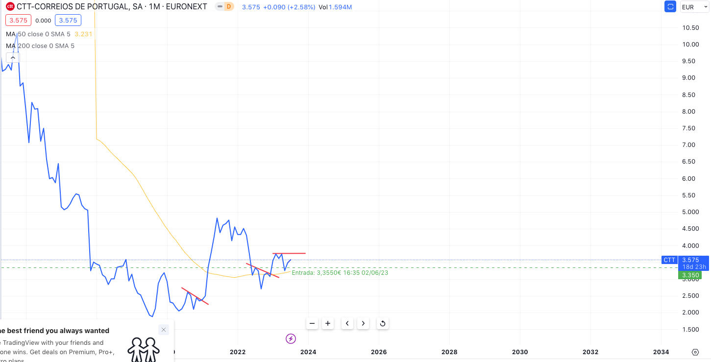 Na parte mais recente do gráfico, a partir de 2020, o PSI20 tem vindo a subir e está a negociar entre duas linhas: uma linha verde e uma linha laranja. Se o PSI 20 descer abaixo de 5292, considero que a tendência deixa de ser ascendente. Se continuar acima da linha verde melhor ainda para a bolsa portuguesa.