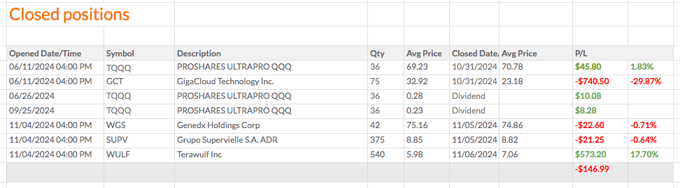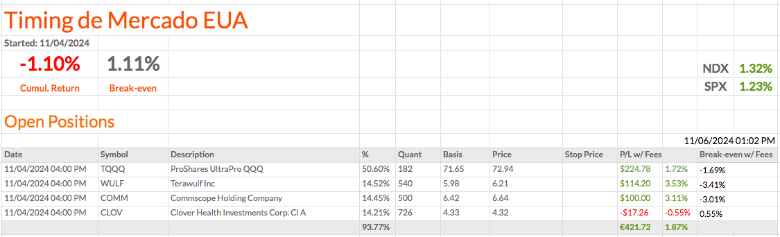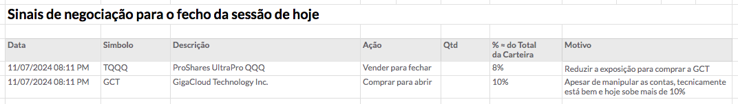 Estou a levar estas carteiras mais a sério do que as outras estratégias que tive, onde só comprei e mantive. No entanto, também não quero estar constantemente a fazer operações. Às vezes vou ter azar, como tive com a COMM e a COMP, e outras vezes vou ter sorte, como com a WULF, que abriu a subir mais de 12%, ou hoje com a GCT, que está a subir mais de 9% no PREMARKET e talvez abra em alta, embora seja uma ação manipulada. No verão, via-a subir no PREMARKET mais de 4% e 5% e acabava o dia a descer. Mas agora acho que a tendência mudou e que pode acontecer o oposto do que aconteceu no verão. No entanto, é uma ação arriscada, porque é manipulada.