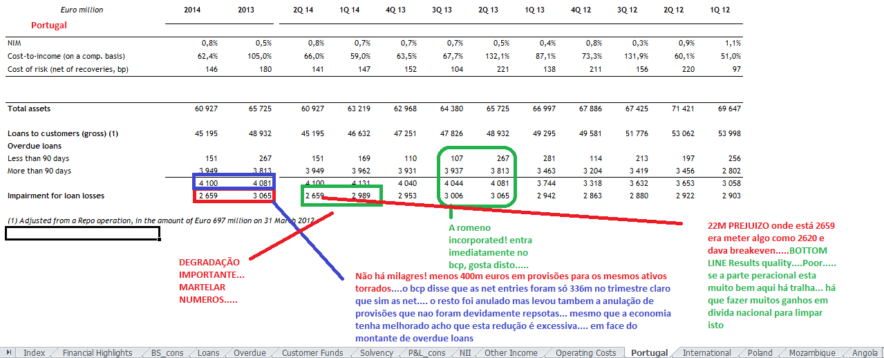 Mas a questão não é o per.... a questão é o capital que sem cocos em basel 3 pouco passa de 7%... e que vai impedir ate segundo o prospeto o banco de dar dividendos até 2017..e o mal parado em portugal que vou justificar com 2 imagens nao tenho tempo para mais que o banco martelou neste Q2 ....é bom que o bcp arranje proximamente muitos ganhos com divida publica.... senão mesmo poupando 70 ou 80m em cocos vao apanhar uma surpresa.... nas imparidades.... ( relenbrar que este Q2 o bcp fez mais valia nos seguros e menos valia na romenia liquido deu +30m e +60m em divida publica sendo que deste tipo espero mais a caminho...)