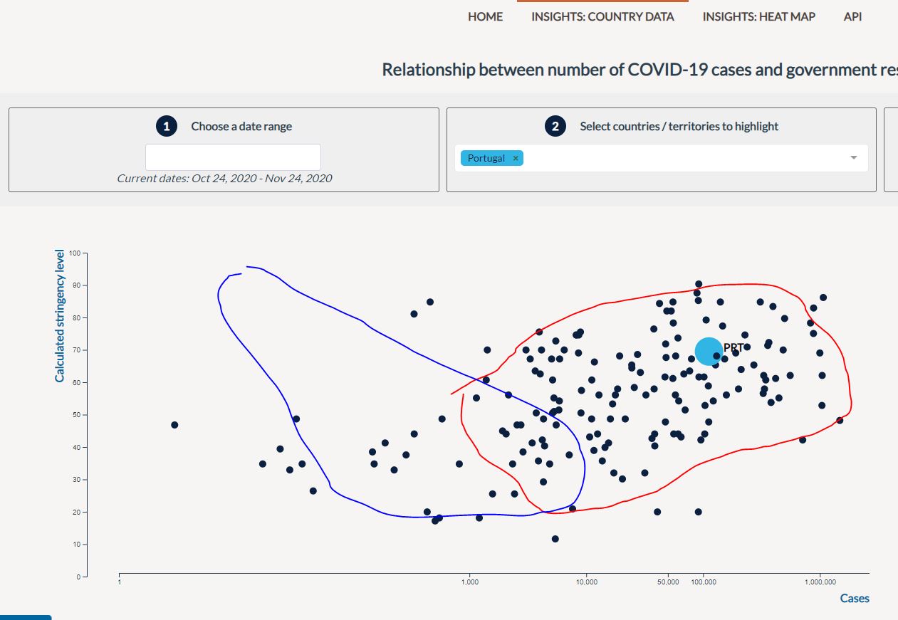 O que parece é que o numero de casos leva a que os governos tomem medidas mais duras (rascunho vermelho) e não que as medidas mais duras levam a menos casos, que levaria a uma dispersão do genero rascunho azul.