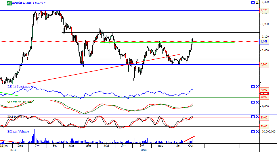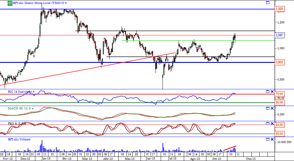 Tem um pequena resistência de curto prazo na casa dos 1,10 mas ultrapassando em alta esta resistência, tem caminho livre para atacar uma resistência bem mais dura de roer que são os 1,30.