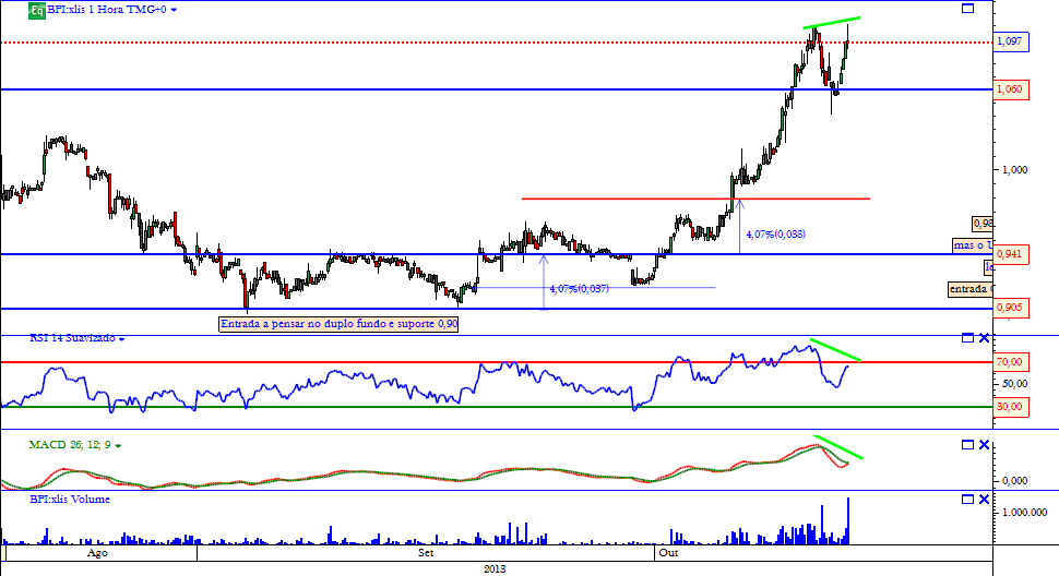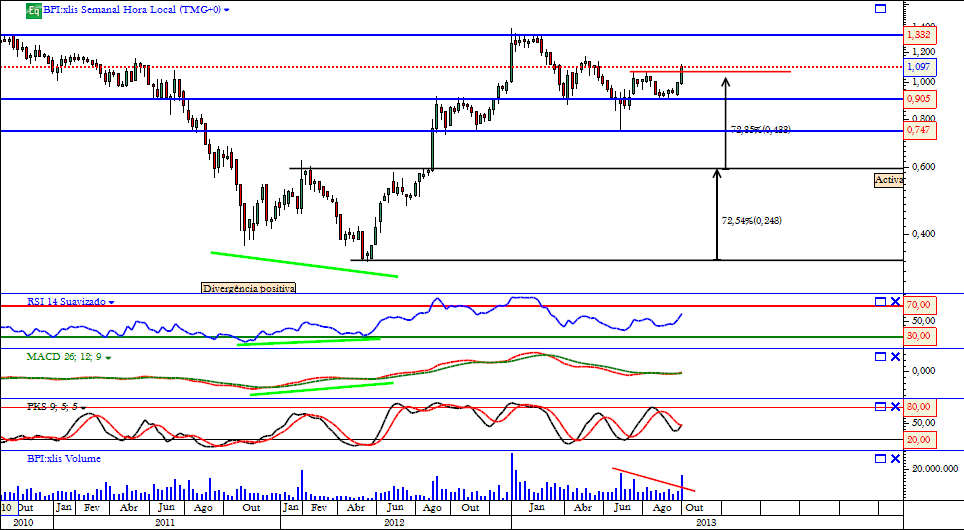 Fecho semanal em máximos, com bom volume, confirmando um novo higher high. O cenário para o médio prazo tornou-se bastante optimista, não me espantava que até ao final do ano assistisse-mos ao ataque à resistência dos 1,33€ (com as respectivas ondas pelo caminho).