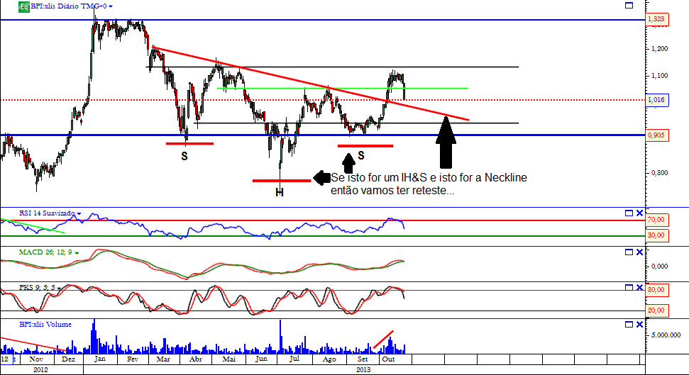Se olharmos para as duas últimas semanas de negociação vemos que se tem estado a gerar uma divergência bullish nos volumes, característica das consolidações. Pelo aspecto, e apesar de não ter havido ainda uma quebra confirmatória, parece estar a formar-se um pennant. A activar-se teria como projecção a zona dos 1,3, precisamente o ponto de maior resistência.