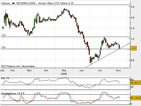 No 1º com uma imagem de 2 anos identificando as próximas resistências mais importantes: a 1º a 1,23-1,25€ máximo intraday de 24-07-2008 e a 2º a 1,87 que aguentou a cotação a 22-01-2008.