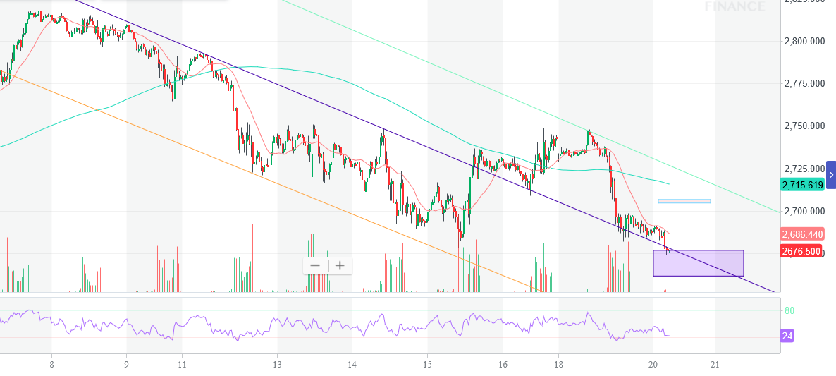Ideia para hoje, foi à resistência do canal, voltando à tendência entrada com venda a 2650, abaixo da media móvel vermelha, e recompra a 2635 (15 pontos). STOP acima dos 2675.