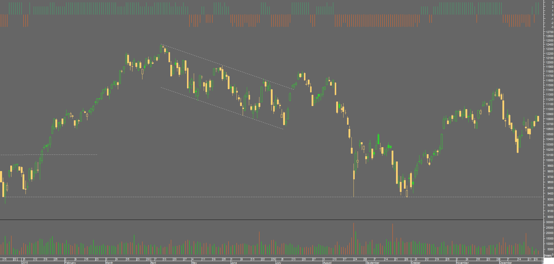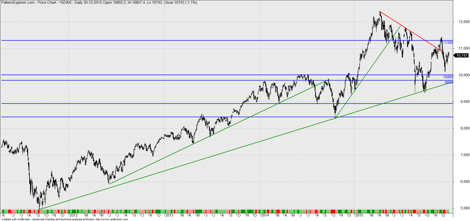 eis um exemplo de como se pode ver um canal no DAX. a questão é: devo comprar? um indicador/sinal para decidir em canais é não comprar se o teste for proximo temporalmente de um anterior teste. portanto, por esta ordem de razões, este caso era um "passo".