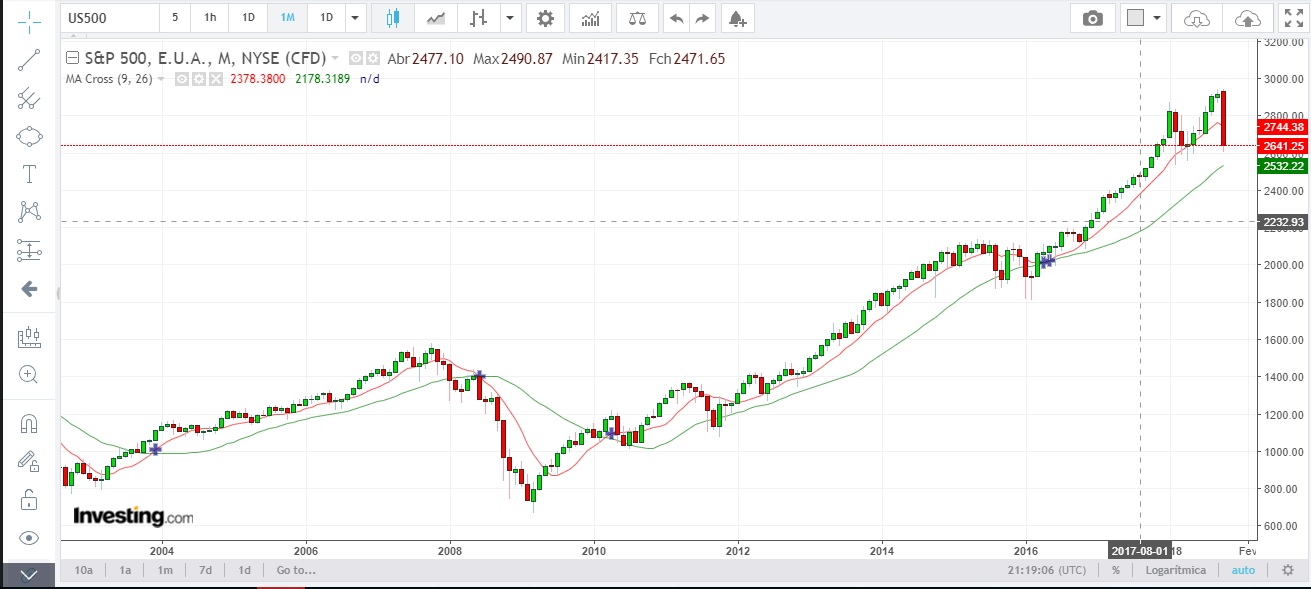 Desde 2010 o S&P500 fechou por 4 vezes abaixo da MM9 e das 4 vezes recuperou...Em 2016 esteve quase a activar uma 'dead-cross'.