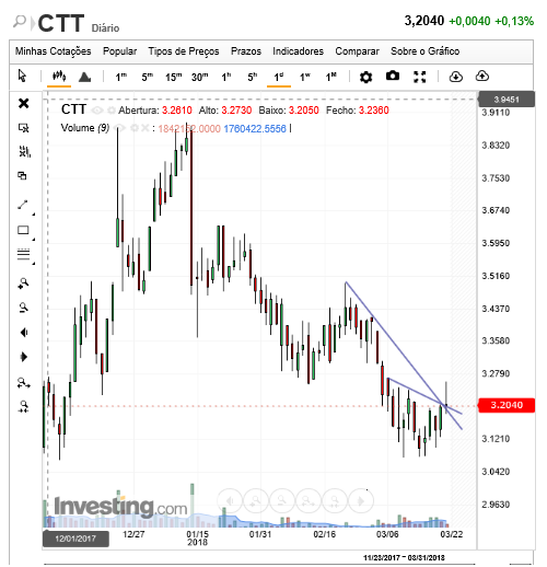 Já agora: disse que a cotação dos CTT está a esboçar um "head and shoulders" invertido, mas esqueci-me de dizer que tal é aparente no gráfico de cotação de fecho.