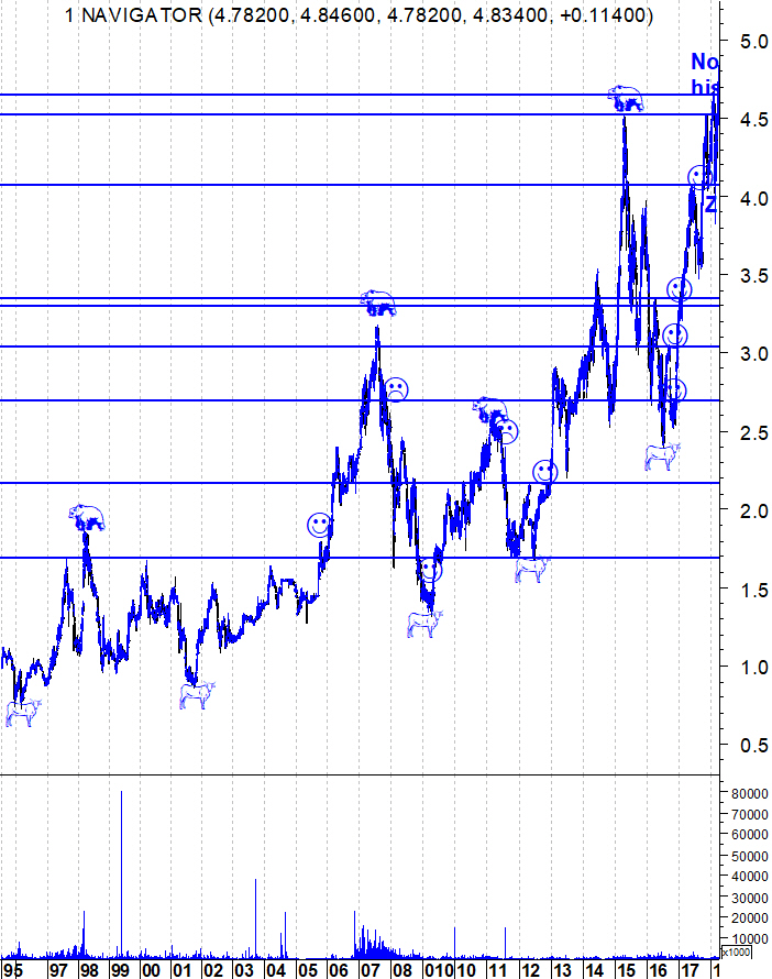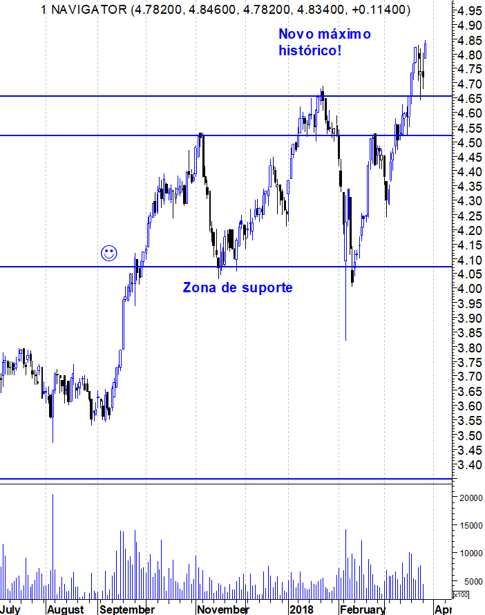 Aí fui eu à segunda página do fórum para ir buscar um tópico de uma acção que está hoje a fazer novos máximos históricos. Sim, a Navigator está a cotar hoje ao valor mais alto de sempre. Aqui ficam os gráficos de um "Bull Market" imaculado.