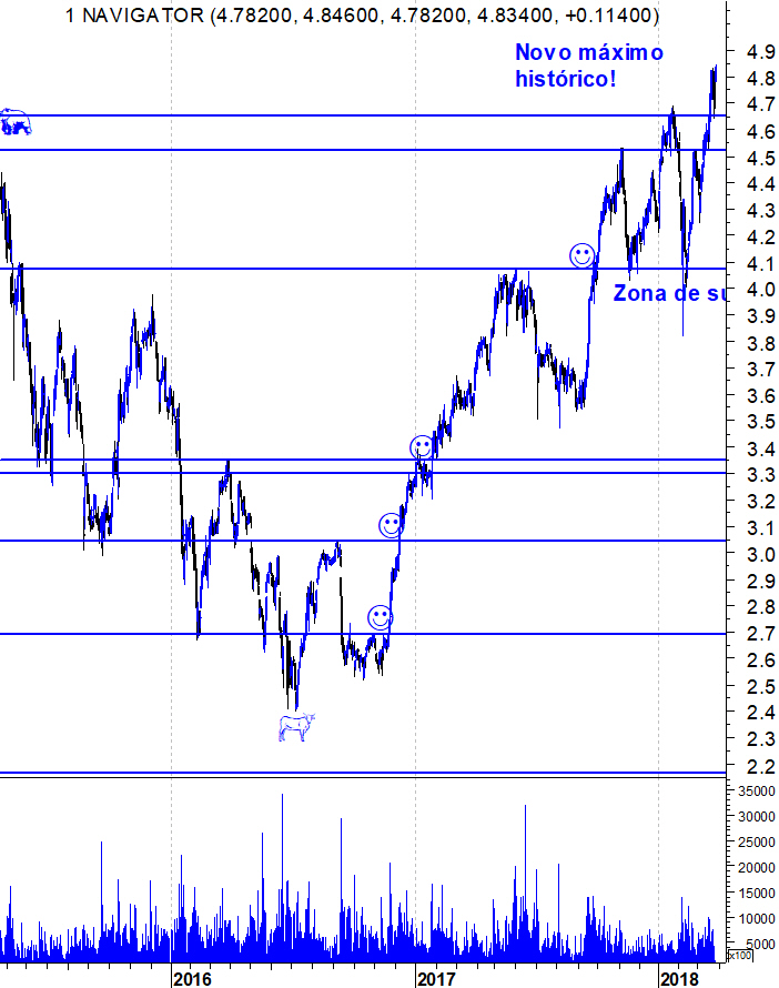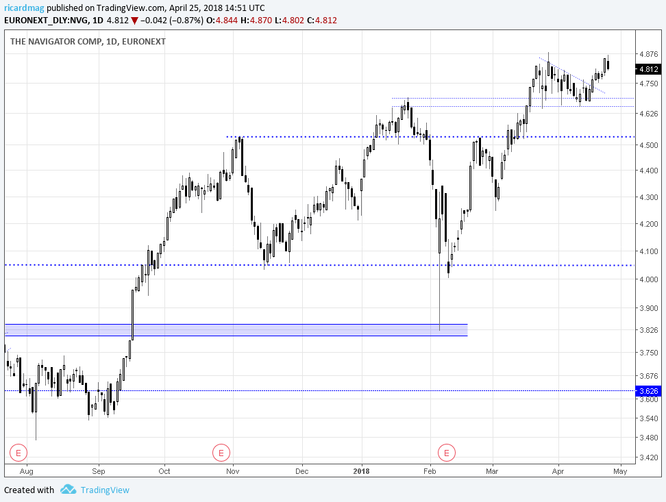 Não concordo com a visão de poder estar a formar-se um duplo topo. A minha aposta é que após anúncio do valor do dividendo (deve estar para breve) a Navigator romperá esta zona dos 4,90€.
