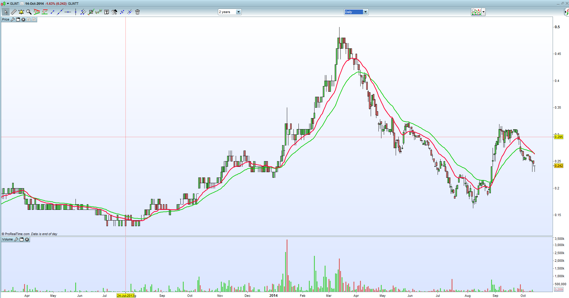 O volume tem sido fantástico. A minha estratégia é sempre a médio/longo prazo por isso deixo aqui um gráfico a 2 anos que pode vir a ser interessante caso a acção venha a confirmar o duplo fundo.
