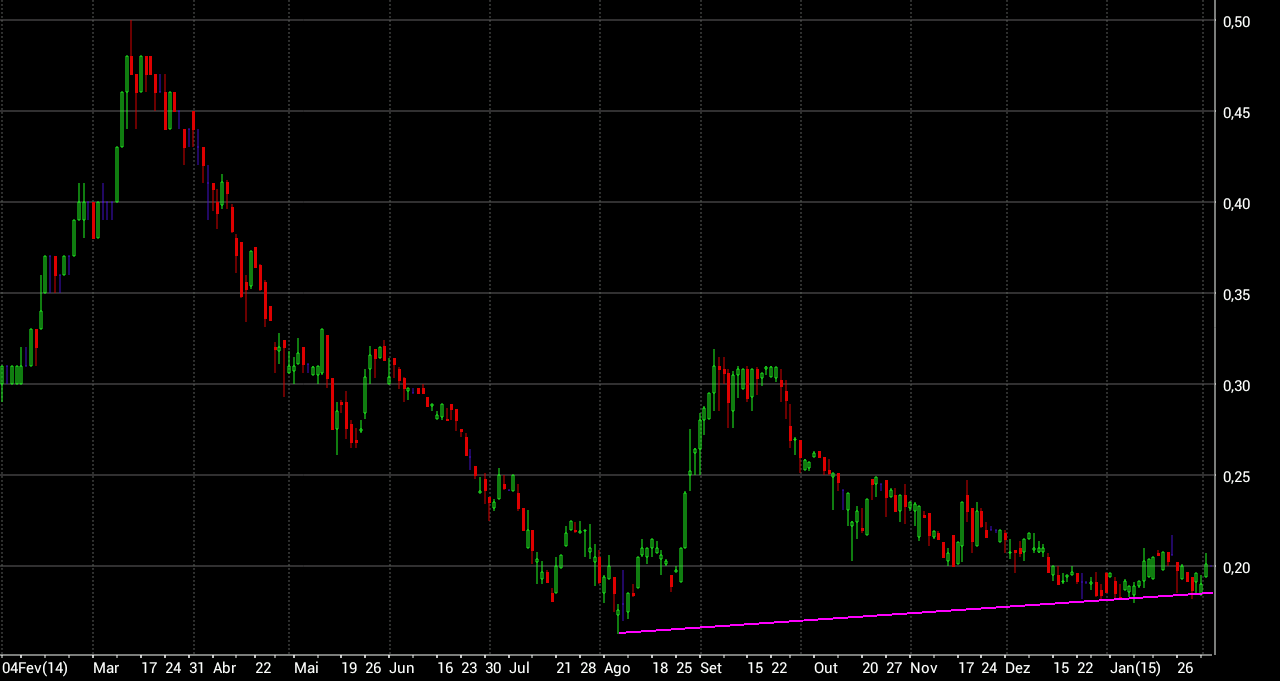 A ação tem vindo a recuperar depois de uma forte descida, o cenário que vejo vendo um gráfico a 3 anos (não o consigo colocar aqui) é que estamos numa zona que foi uma resistência em Novembro de 2013 (0.26-0.27) e que foi quebrada em Janeiro de 2014 e com ida da ação a 0.35.
